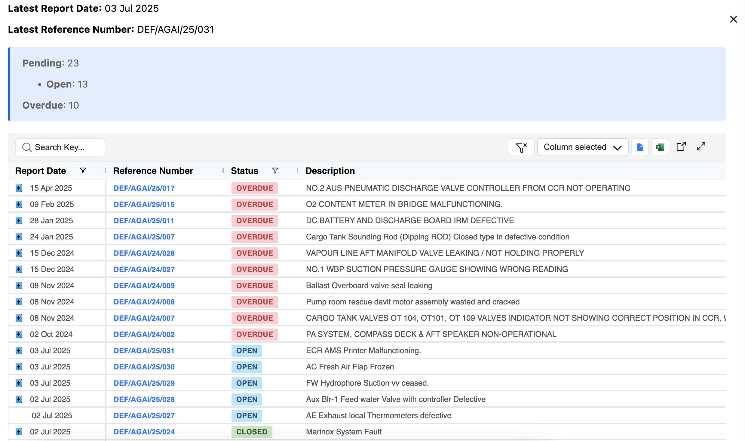 [Report Date, Reference No (link), Status, Description, Target Date, Closing Date, Closing Note, Source]