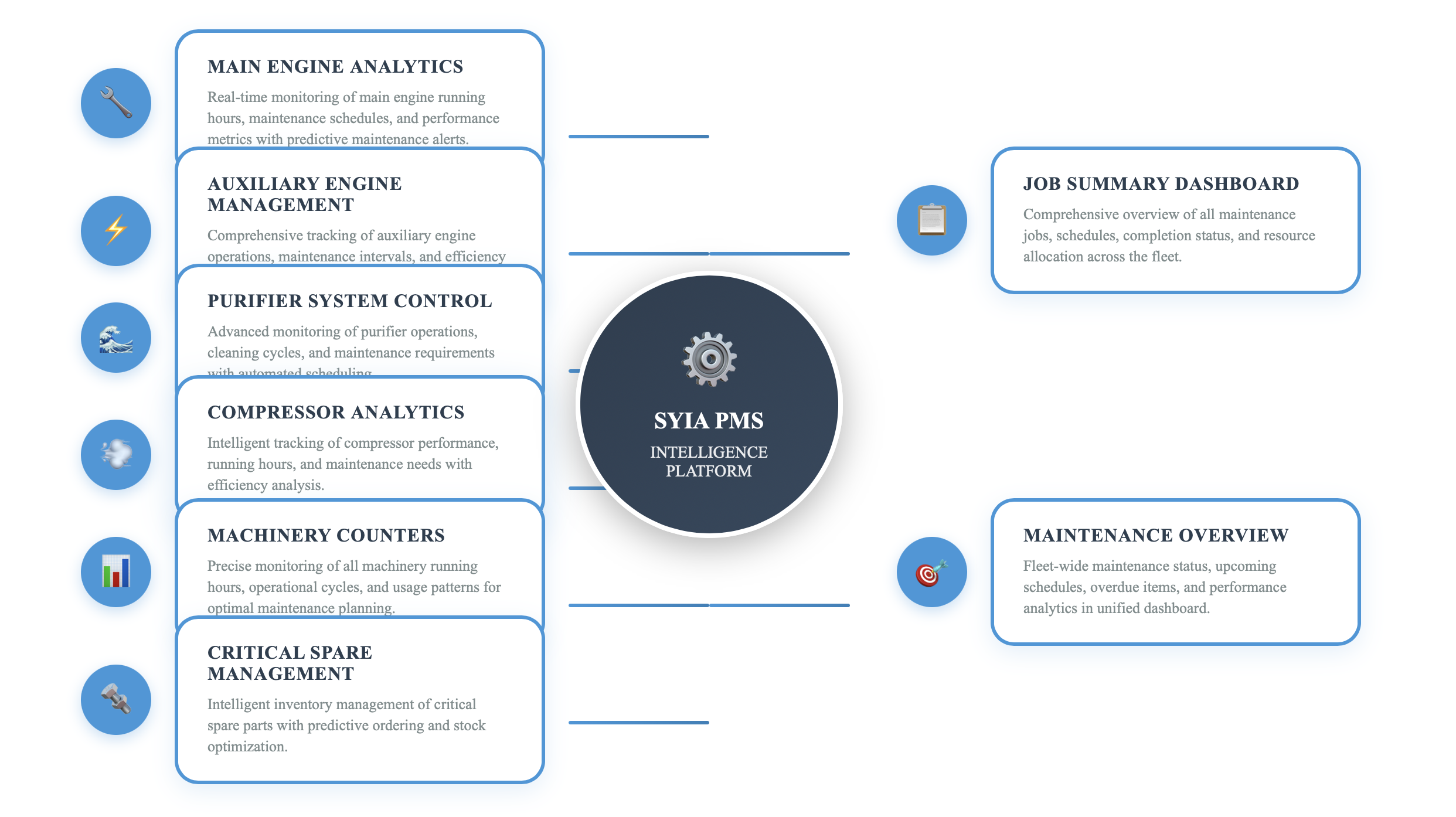 The SYIA PMS Intelligence Platform revolutionizes maritime maintenance management by integrating advanced data analytics, machine learning algorithms, and real-time monitoring capabilities. Our comprehensive system transforms traditional maintenance workflows into intelligent, predictive operations that optimize fleet performance and reduce operational costs.