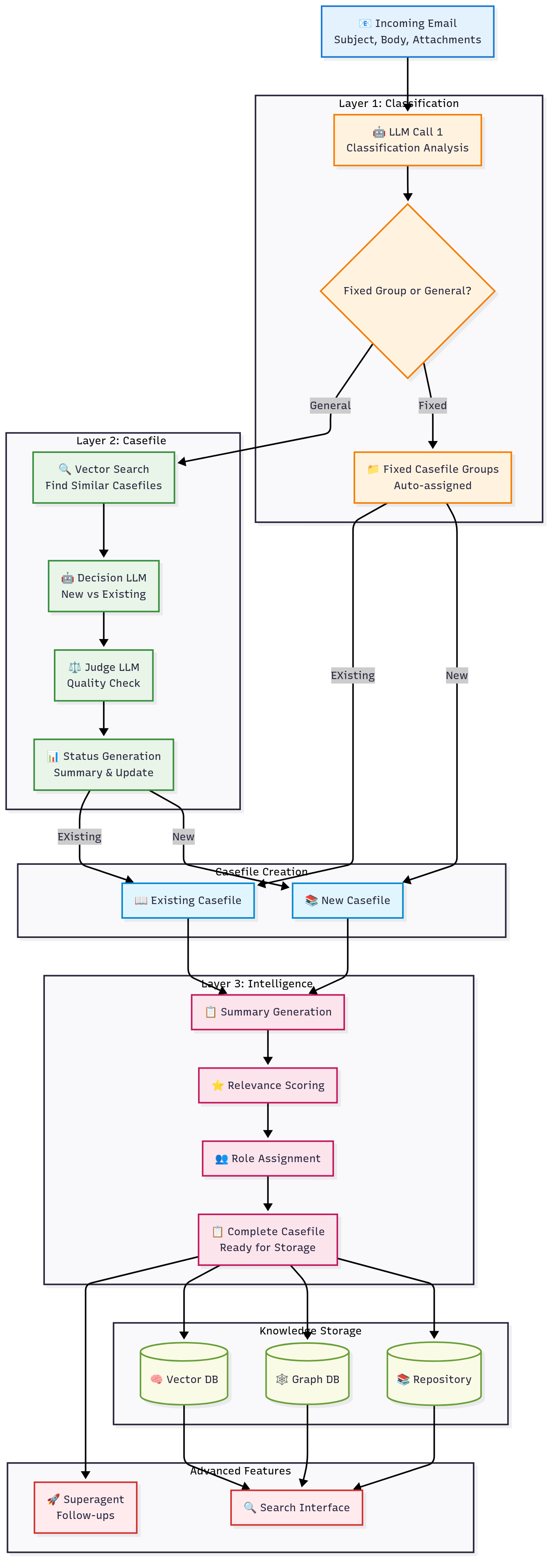Each subsequent layer uses focused, single-purpose LLM calls:- Layer 3: Casefile summary generation and updates