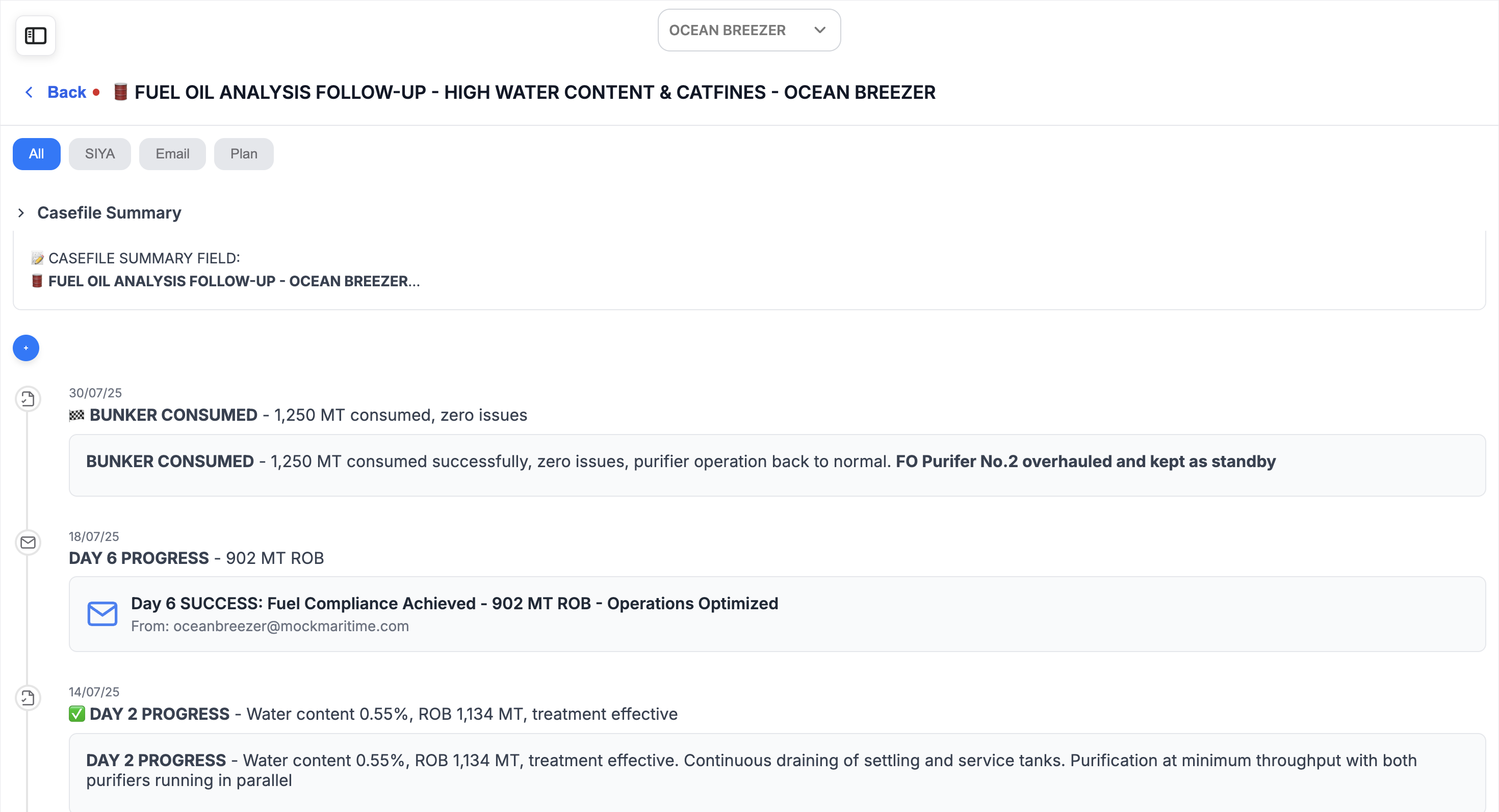 When a casefile reaches a certain complexity or importance threshold, our Siya Superagent automatically takes over, functioning as a dedicated AI analyst for that specific case. Unlike the focused LLM layers that process emails, the superagent operates with full autonomy, using multiple tools and data sources to provide comprehensive follow-up intelligence. Detail in SuperAgent Section.Maritime Domain Implementation: Vessel-Centric Intelligence